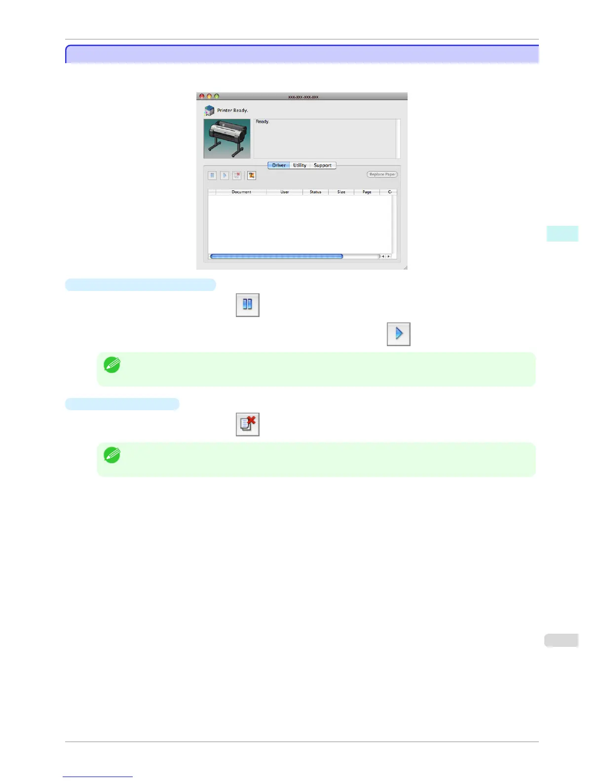 You can use the Driver Panel in imagePROGRAF Printmonitor for operations such as pausing and canceling print