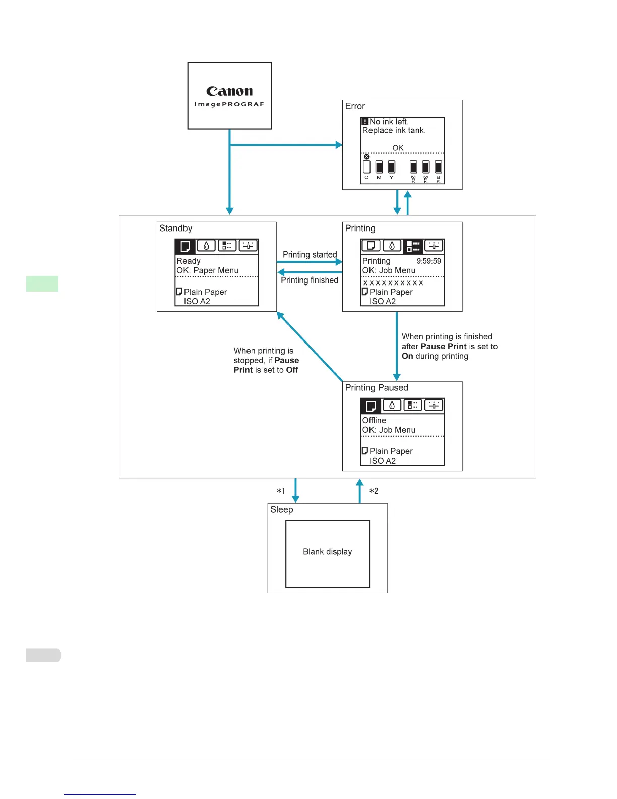 *1: The printer automatically enters Sleep mode when idle for a specific period (by default, five minutes), that is, if no print jobs are