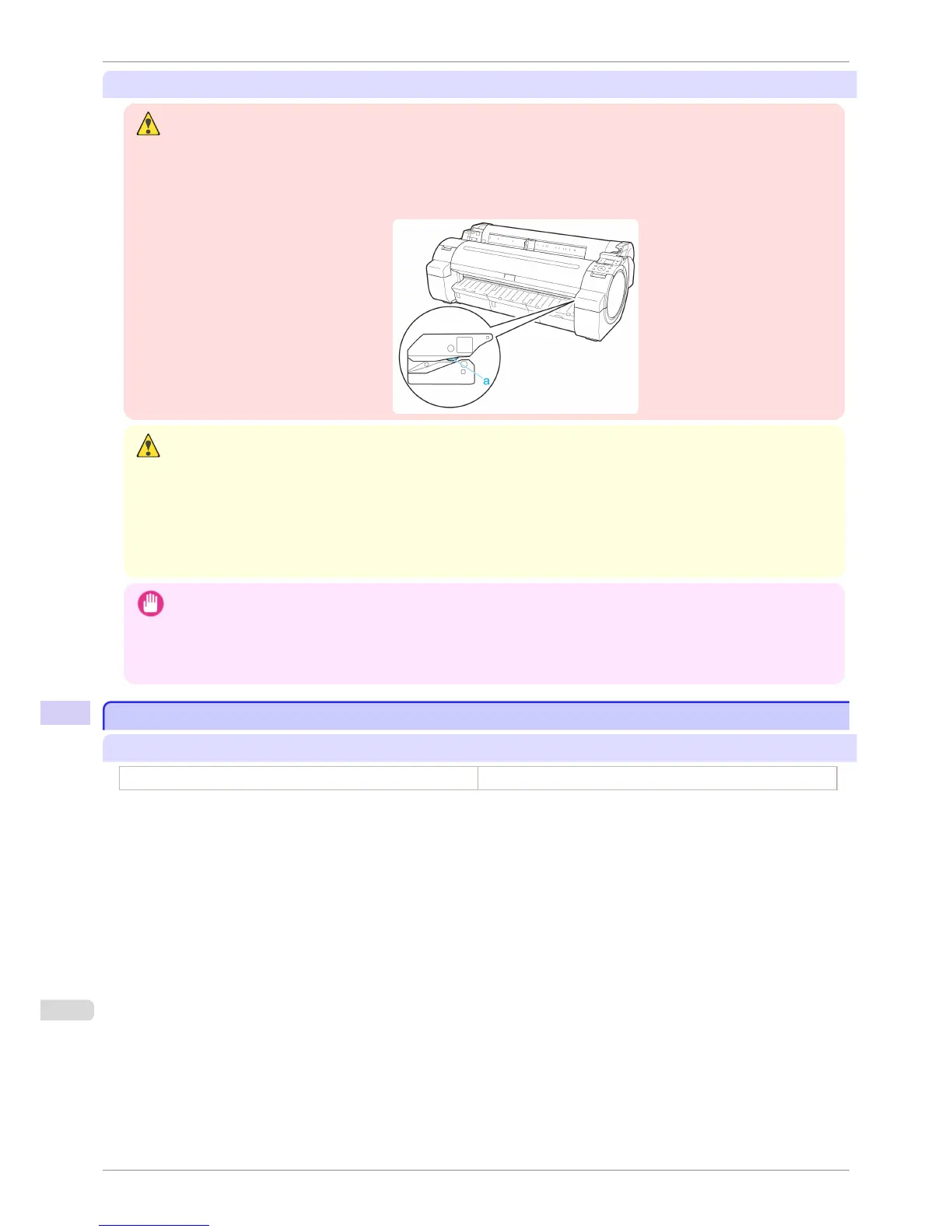 • Never insert your hand into the printer while it is printing. Moving parts inside the printer can cause injuries.
