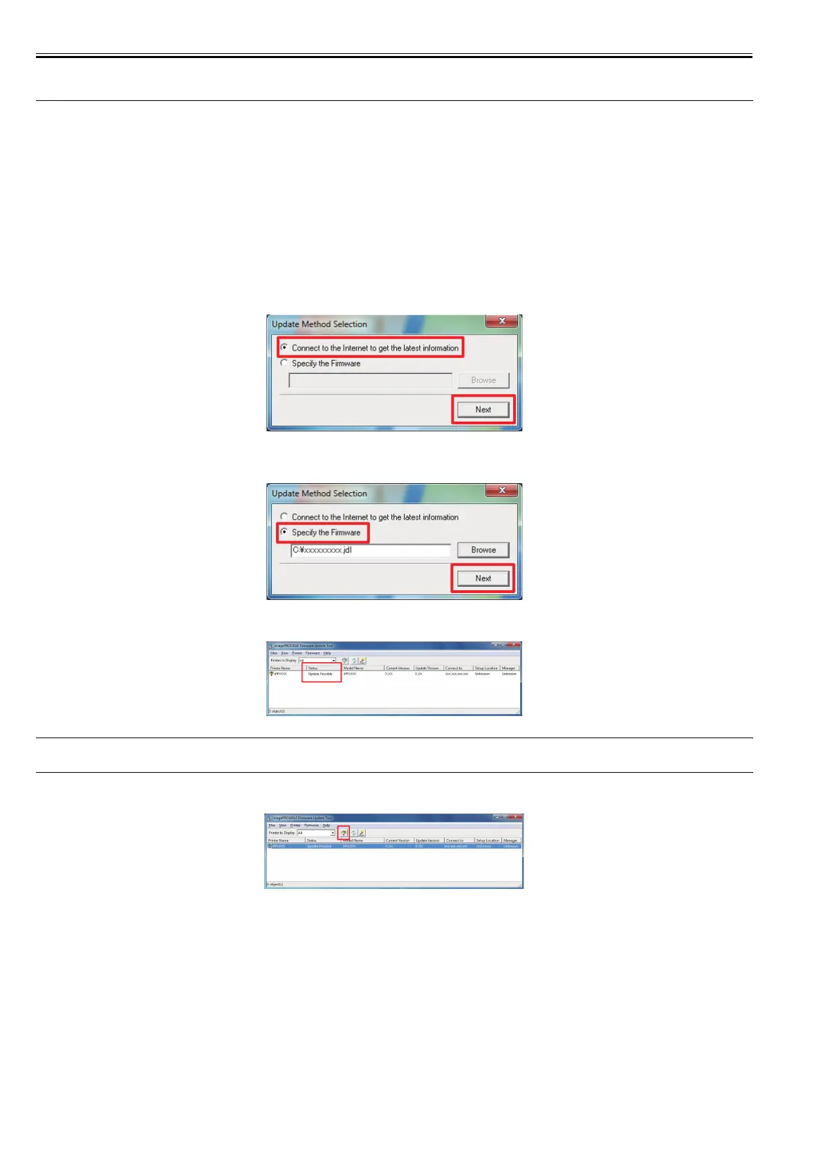 5) The [Update Possible] is displayed in the [Status] field of the printers that a newer firmware is available.