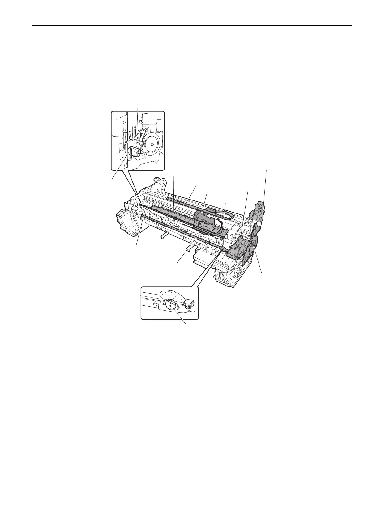Moving parts of the printer include the carriage unit driven by the carriage motor, the carriage belt, the ink tube, the flexible cable, the feed roller driven by the feed