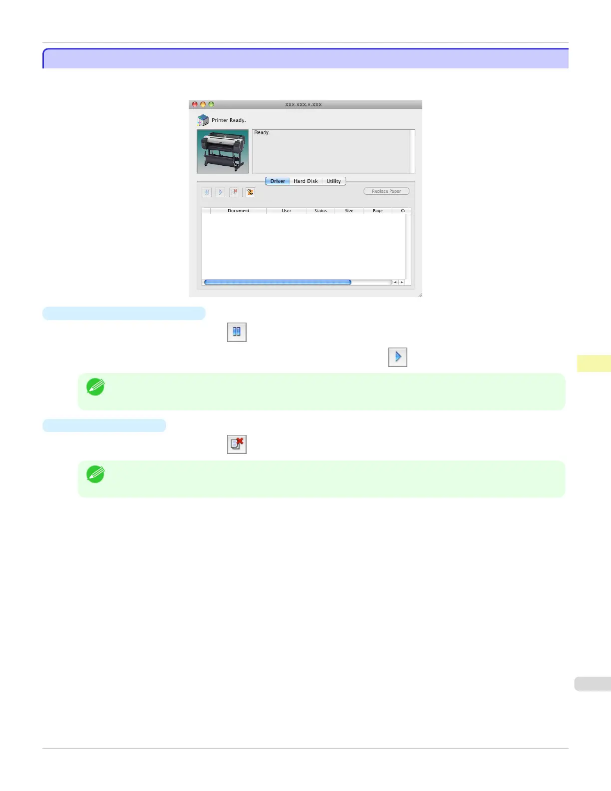 You can use the Driver Panel in imagePROGRAF Printmonitor for operations such as pausing and canceling print