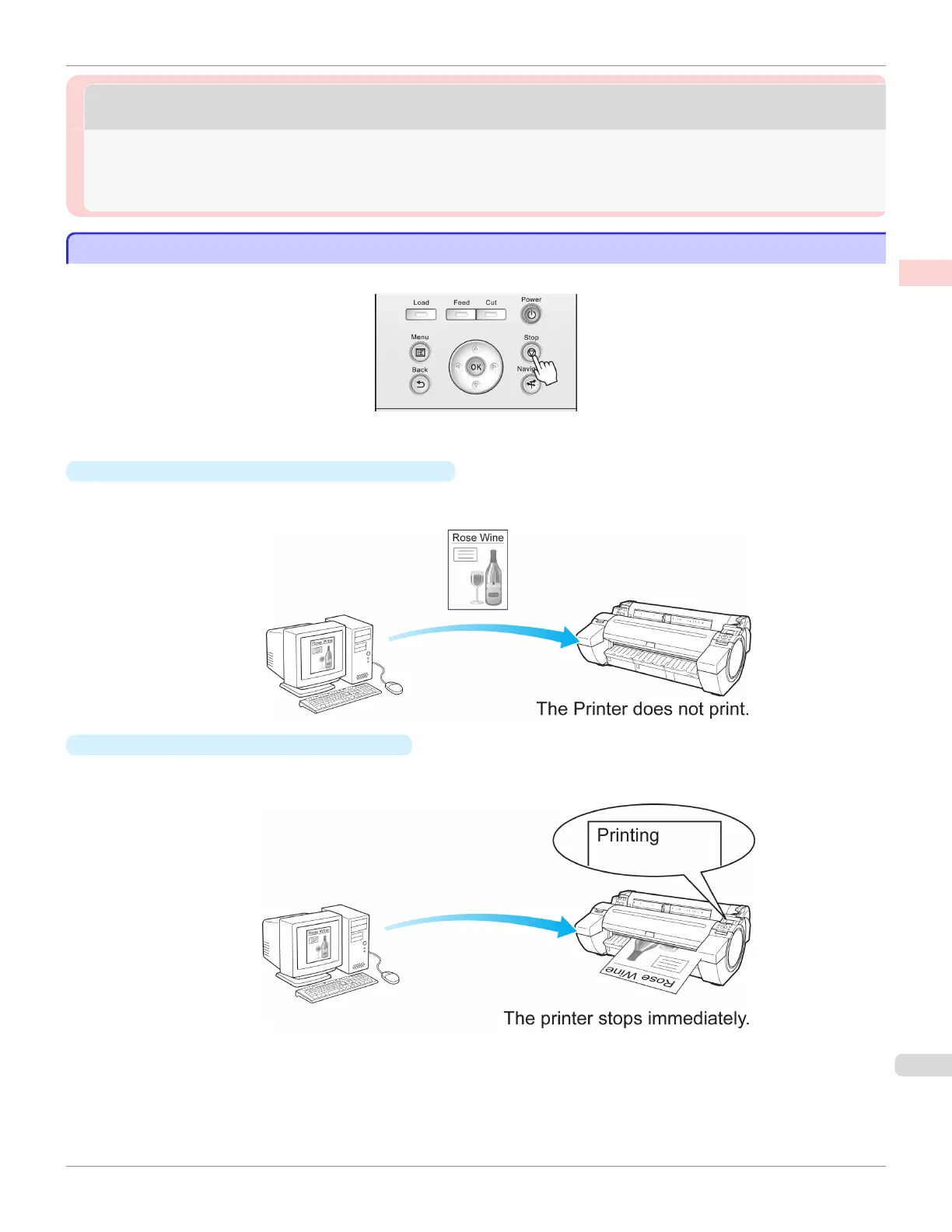 When you press the Stop button during printing, printer operation varies depending on the current status.