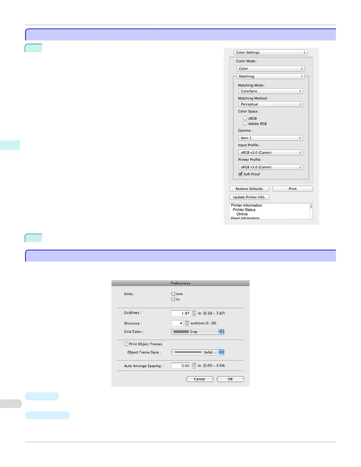 This dialog box appears when you select Preferences from the imagePROGRAF Advanced Preview menu. You can