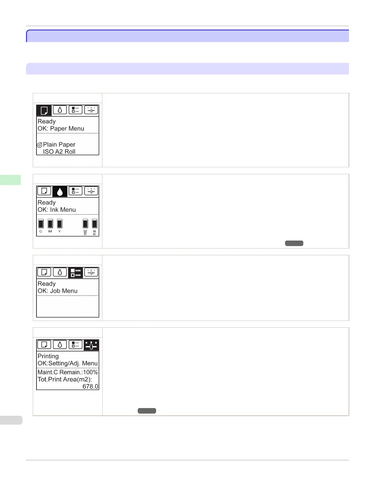Ink tab A tab indicating status and showing menus related to ink. Pressing the OK button when this tab is highligh-