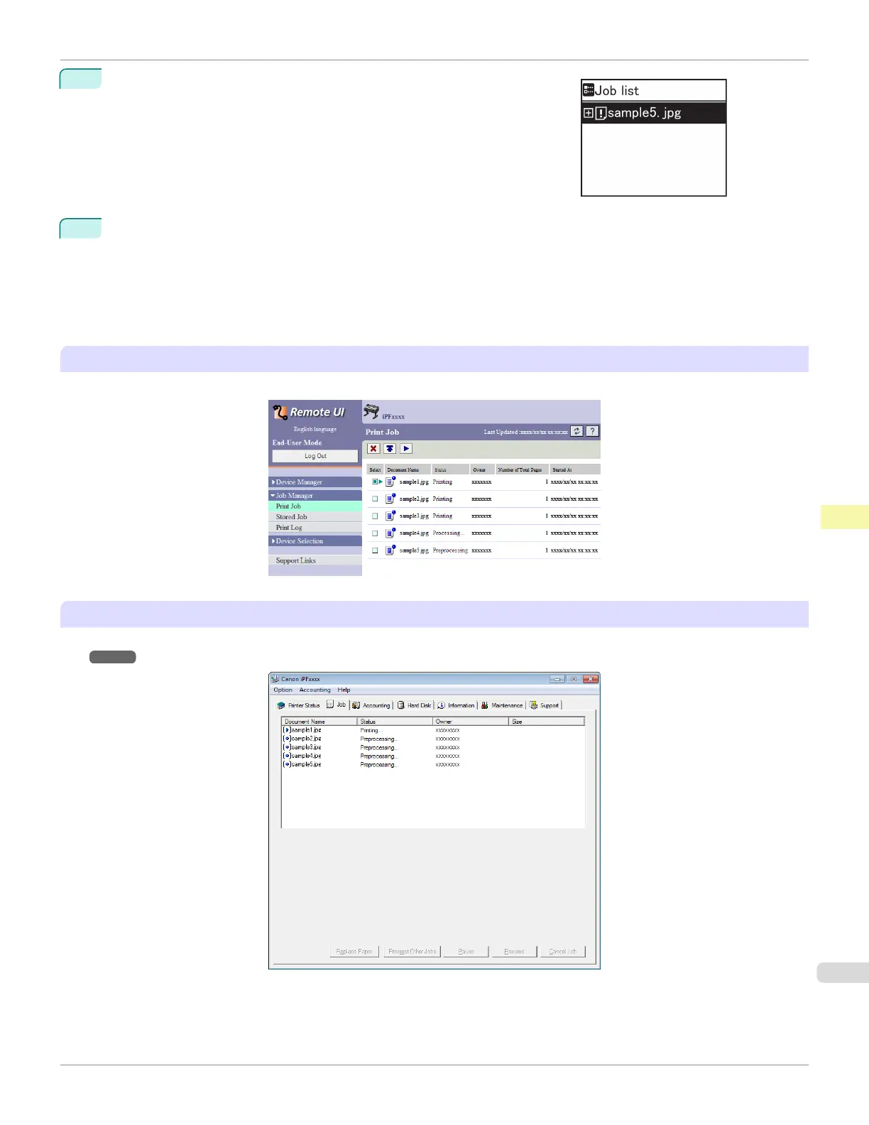 Manage jobs as needed on the Job sheet. For details, see "Job Management Using imagePROGRAF Status Moni-