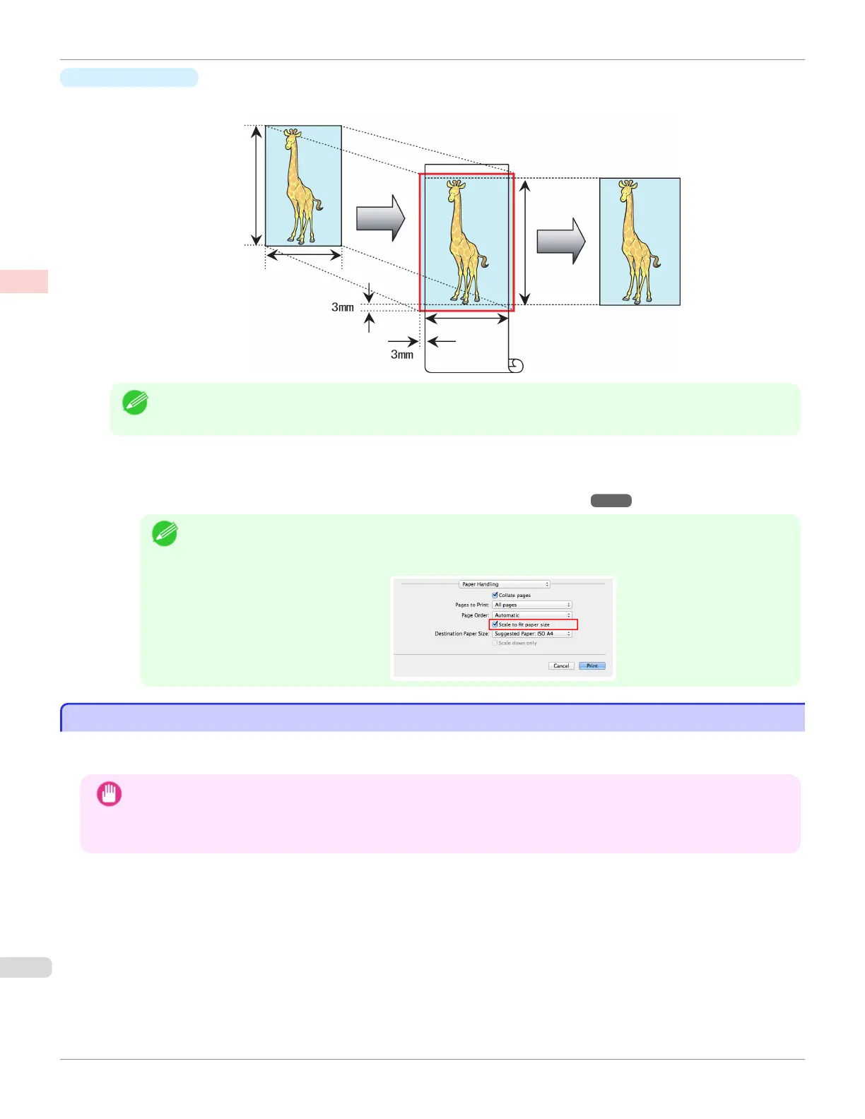 • To perform borderless printing with resizing to fit the paper size on Mac OS, select borderless in Paper Size
