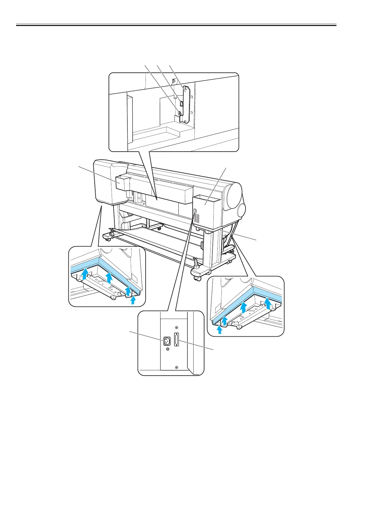 The carrying handle is located on both left and right sides of the bottom. Allow a team of six persons to carry the printer.