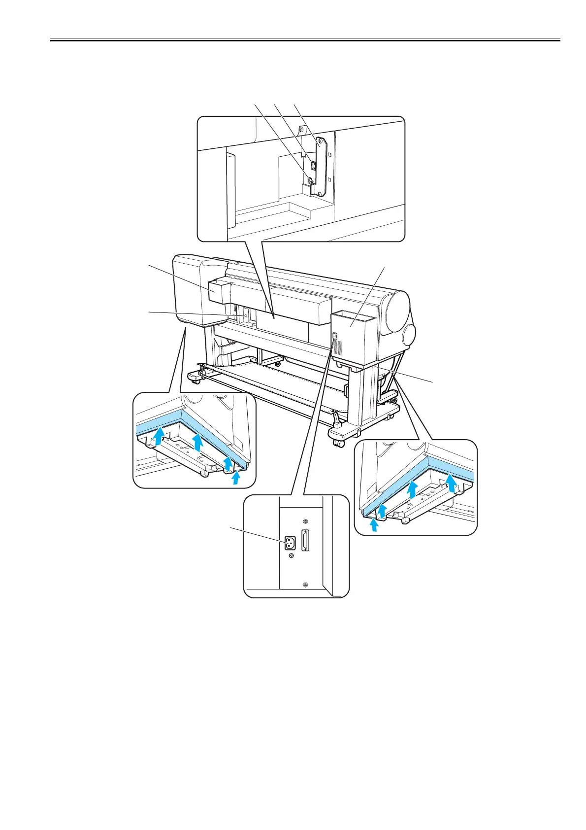 The carrying handle is located on both left and right sides of the bottom. Allow a team of six persons to carry the printer.