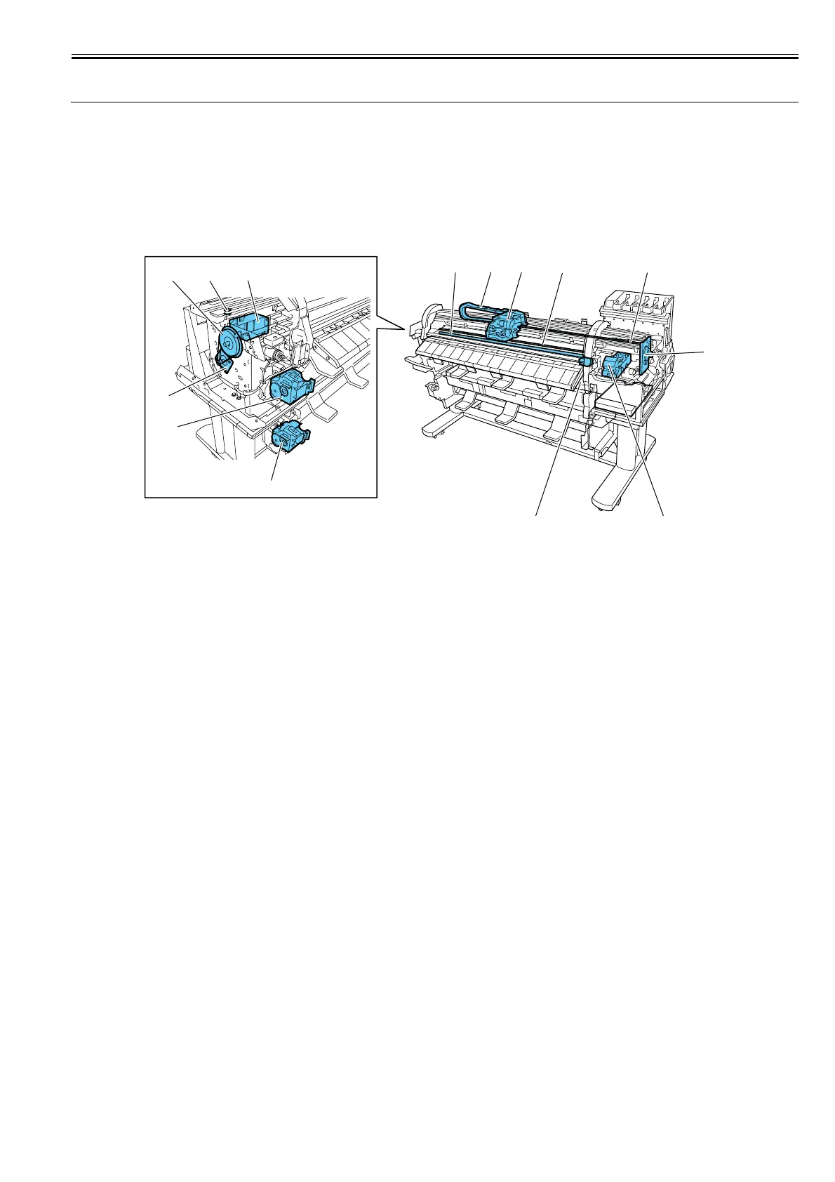 These include the carriage unit activated by the carriage motor, carriage belt, ink tube and flexible cable; feed motor-driven feed roller and pinch roller; and purge