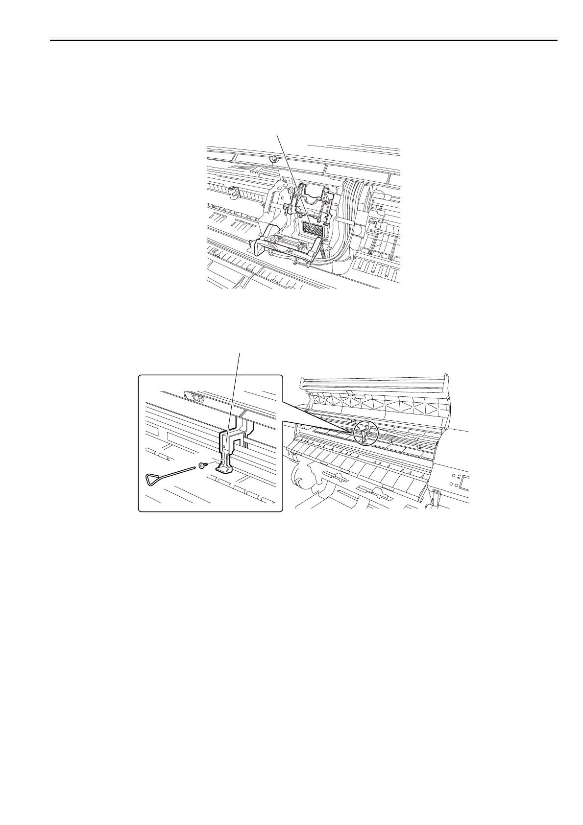 Before transporting the printer, secure the carriage at its home position using belt stoppers[1] so that the carriage does not become separated from the lock arm and