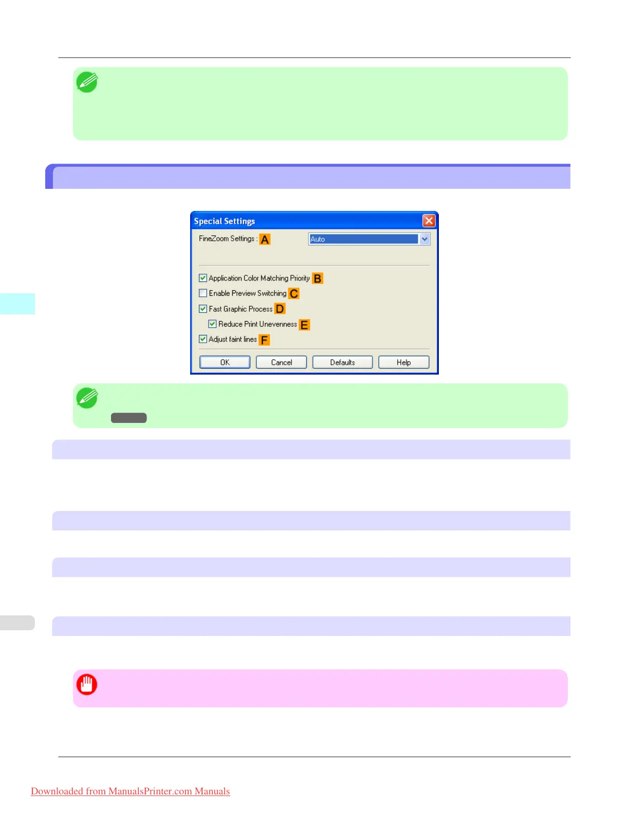 If the printing results are not as you expected, you can change how printing is processed in the Special Settings dialog box.