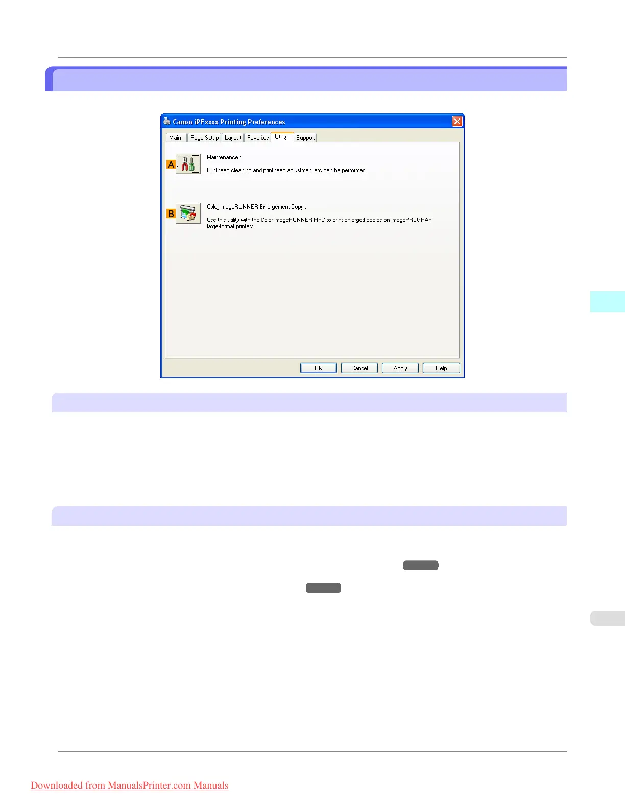 Click to start the imagePROGRAF Status Monitor, which offers the following maintenance for the printer.