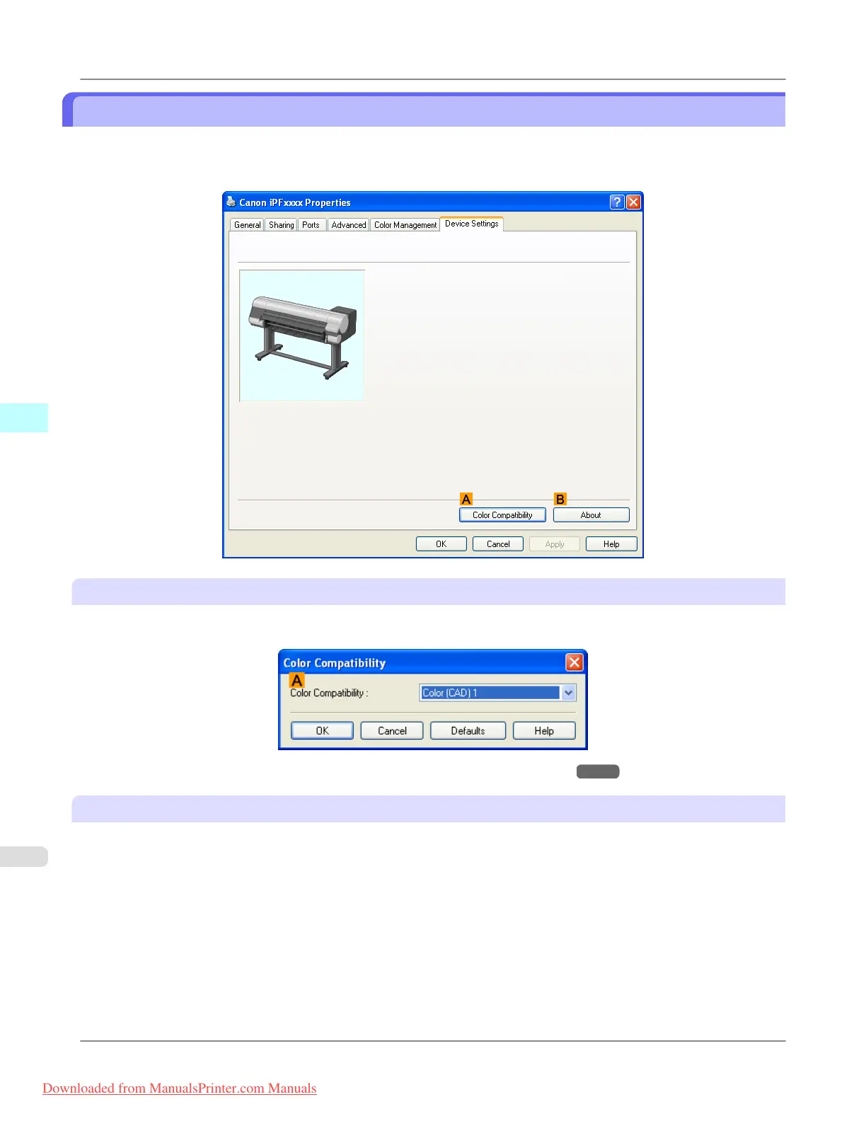 Many settings items on the printer properties sheets are controlled by Windows applications. However, the Device Settings