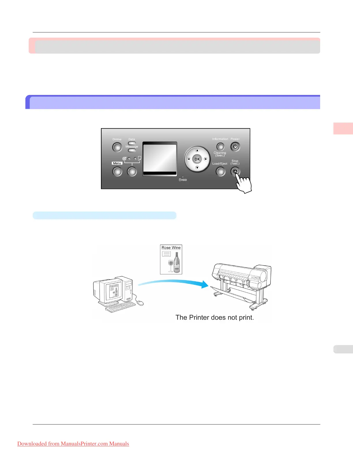 Printer operation varies depending on the status when you hold down the Stop button for a second or more during printing.