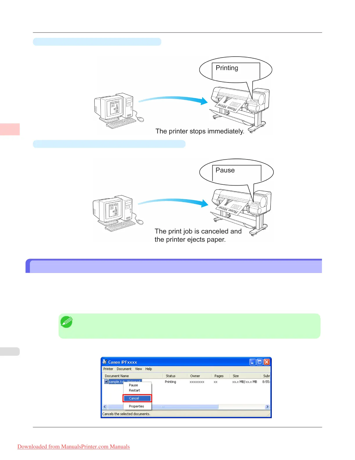 Using imagePROGRAF Status Monitor, you can cancel print jobs that have already been received by the printer or that are
