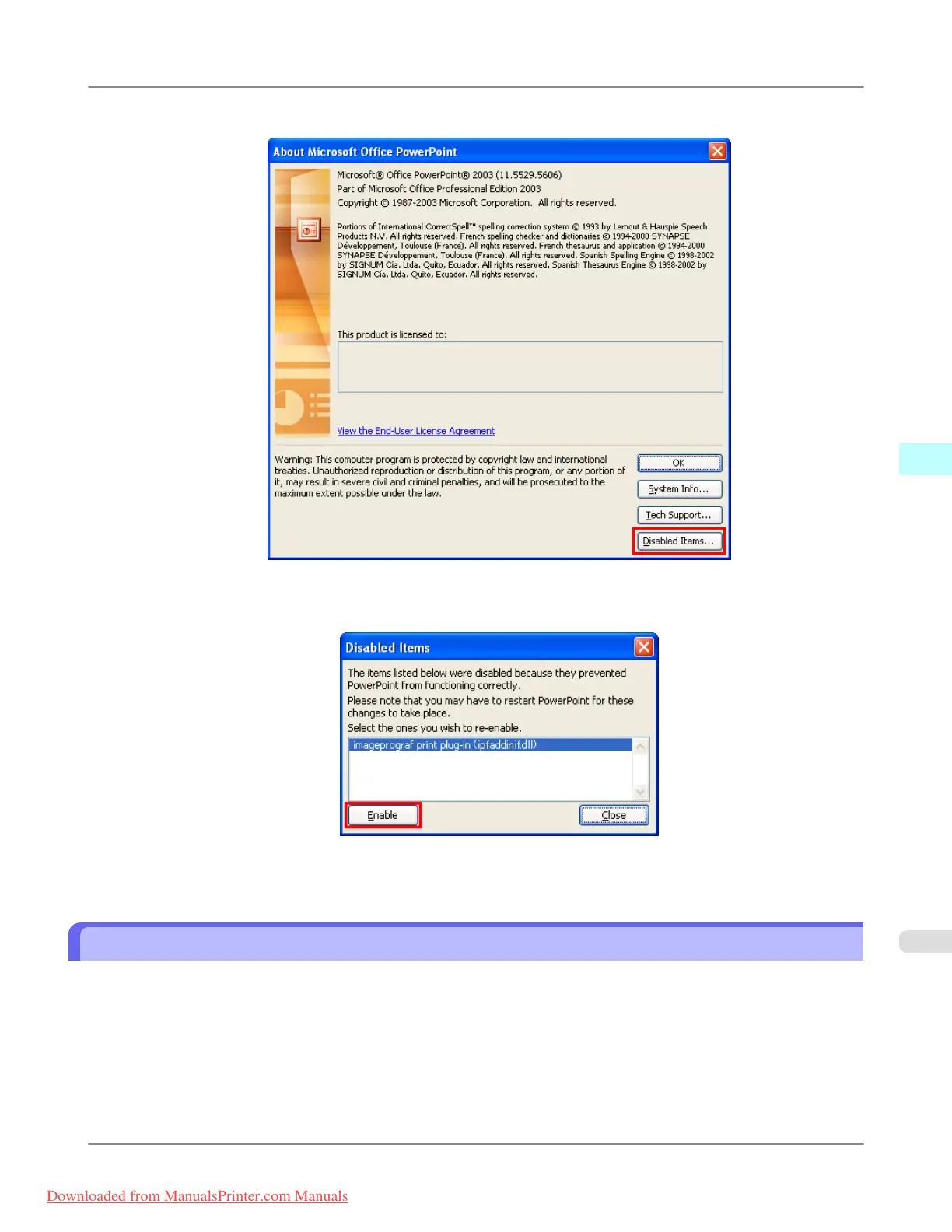 imageprograf print plug-in (ipfaddinif.dll) is displayed in the Disabled Items dialog box, select it and