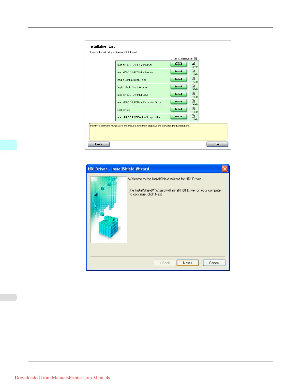 The Installation List appears. Click the Install button of the imagePROGRAF HDI Driver.