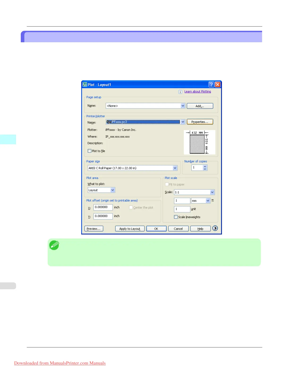 the Name setting under Printer/plotter and confirm that iPFxxxx.pc3 (the name of the printer you use) is