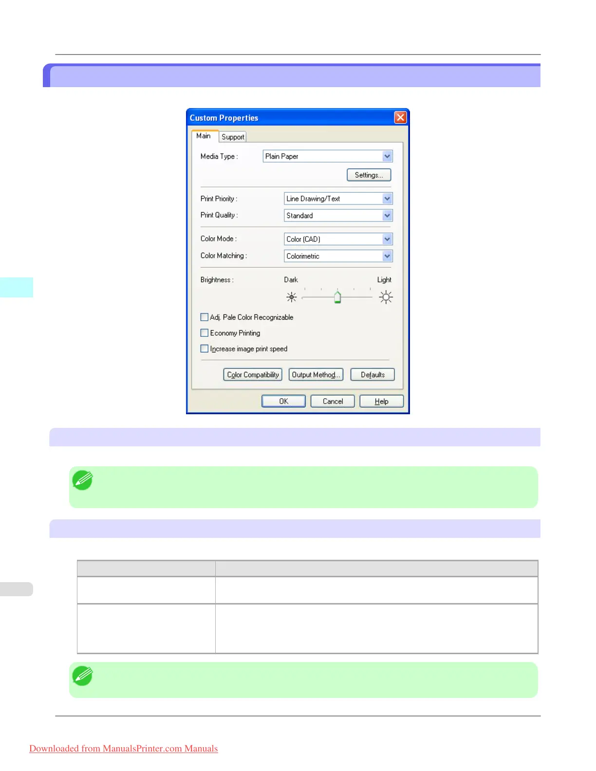 You can perform the settings for the media type, color matching, brightness, and other settings.