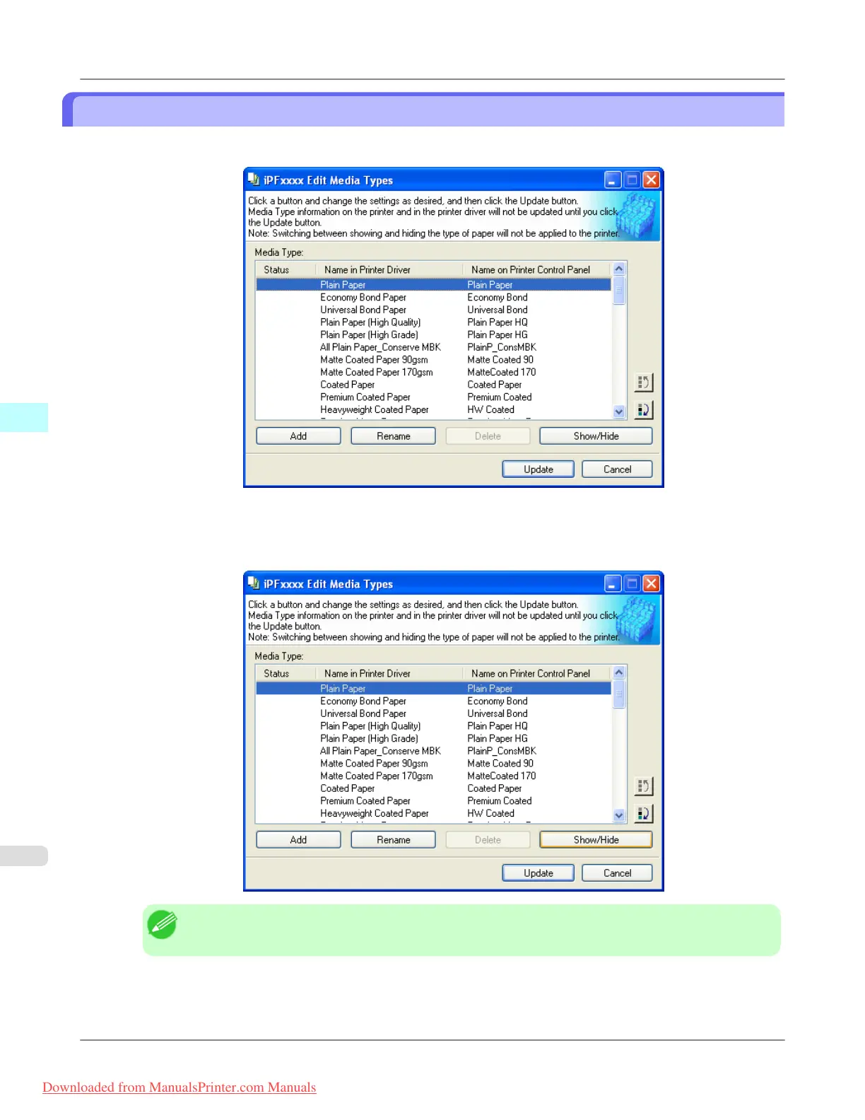 Switching Media Types Display Show/Hide iPF815