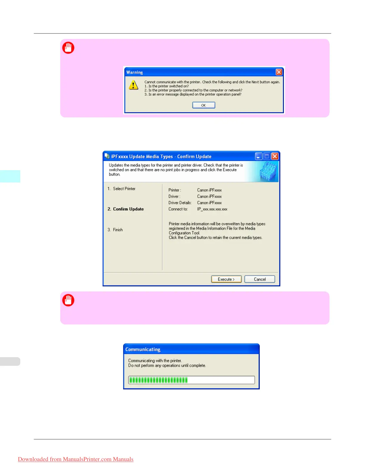 • When the program cannot communicate with the printer, the following warning message is displayed.