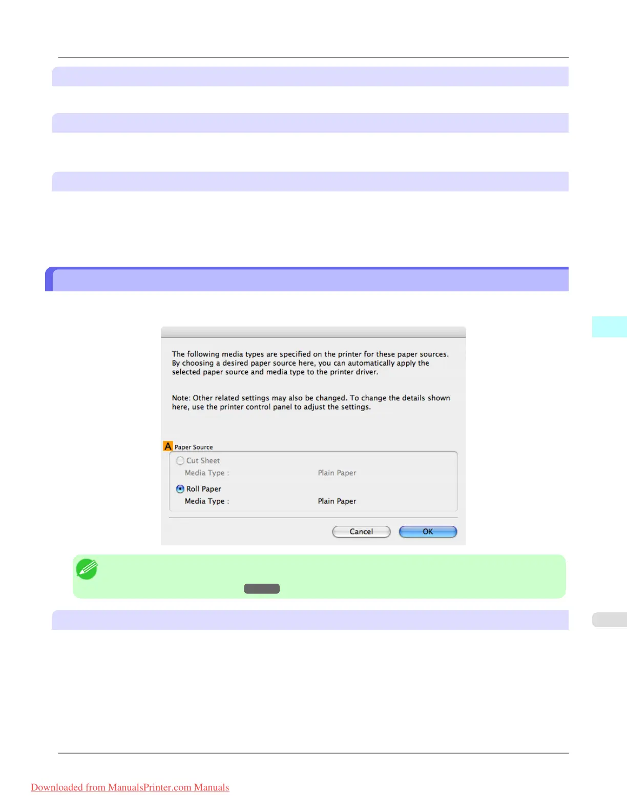 Shows the Paper Source supported by the printer, as well as the type of paper loaded. To update the media type setting in