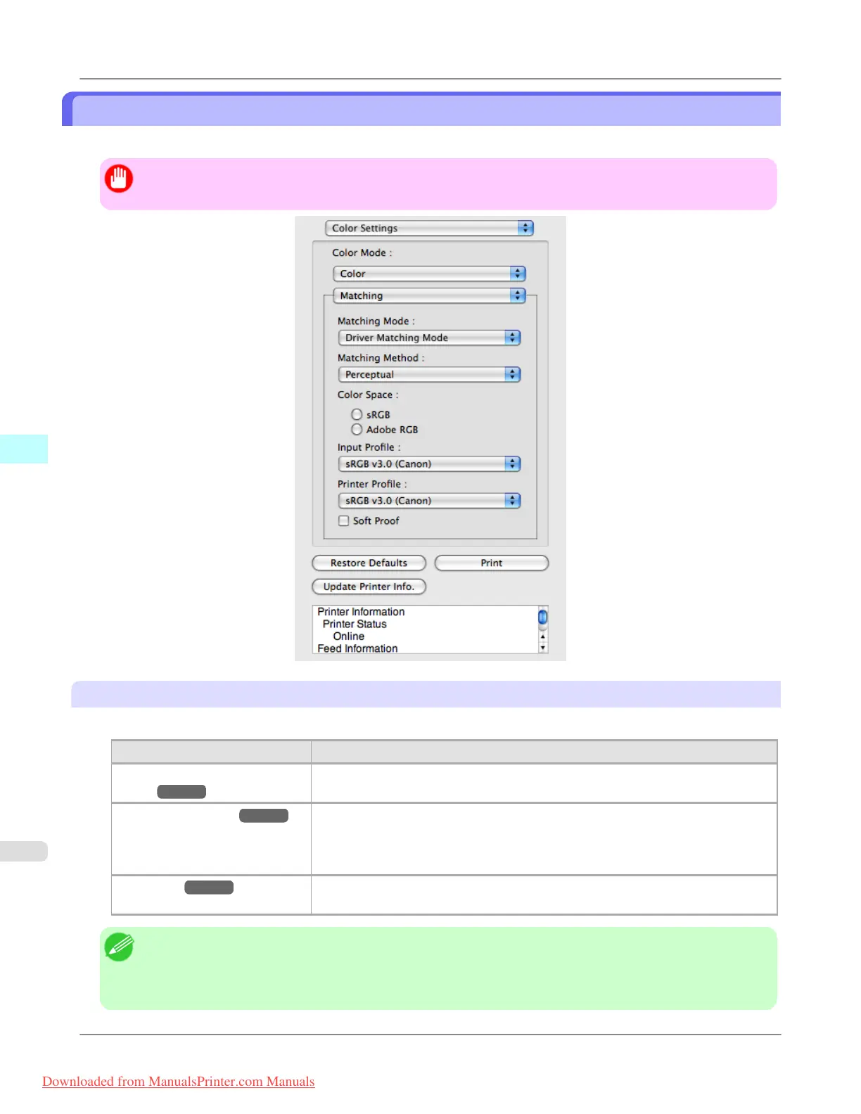 ICC Matching Mode →P.471 Enables color matching using ICC profiles. Select this if you want to print by spec-