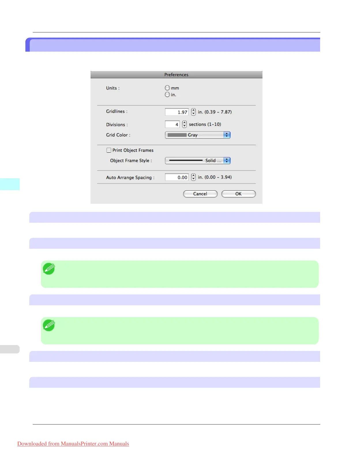 This dialog box appears when you select Preferences from the imagePROGRAF Advanced Preview menu. You can set the