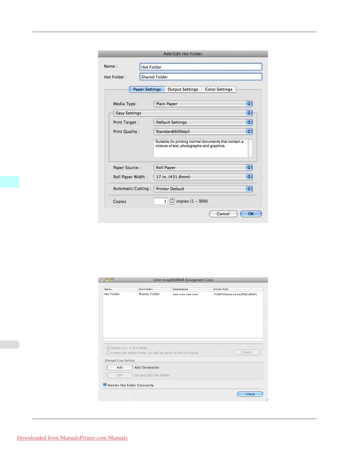 7. Click the OK button. The created Hot Folder is listed in the Color imageRUNNER Enlargement Copy dialog box.