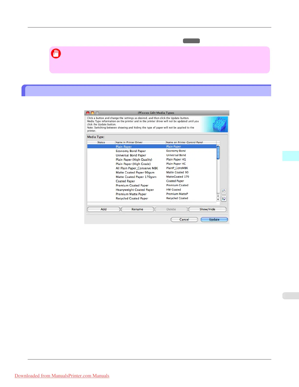 printer driver. Switching between showing and hiding the type of paper will not be applied to the