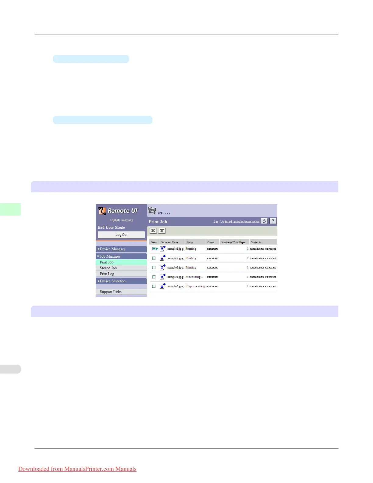 On the Print Job page, select the job to manage and how to manage it. For details, refer to the RemoteUI help.