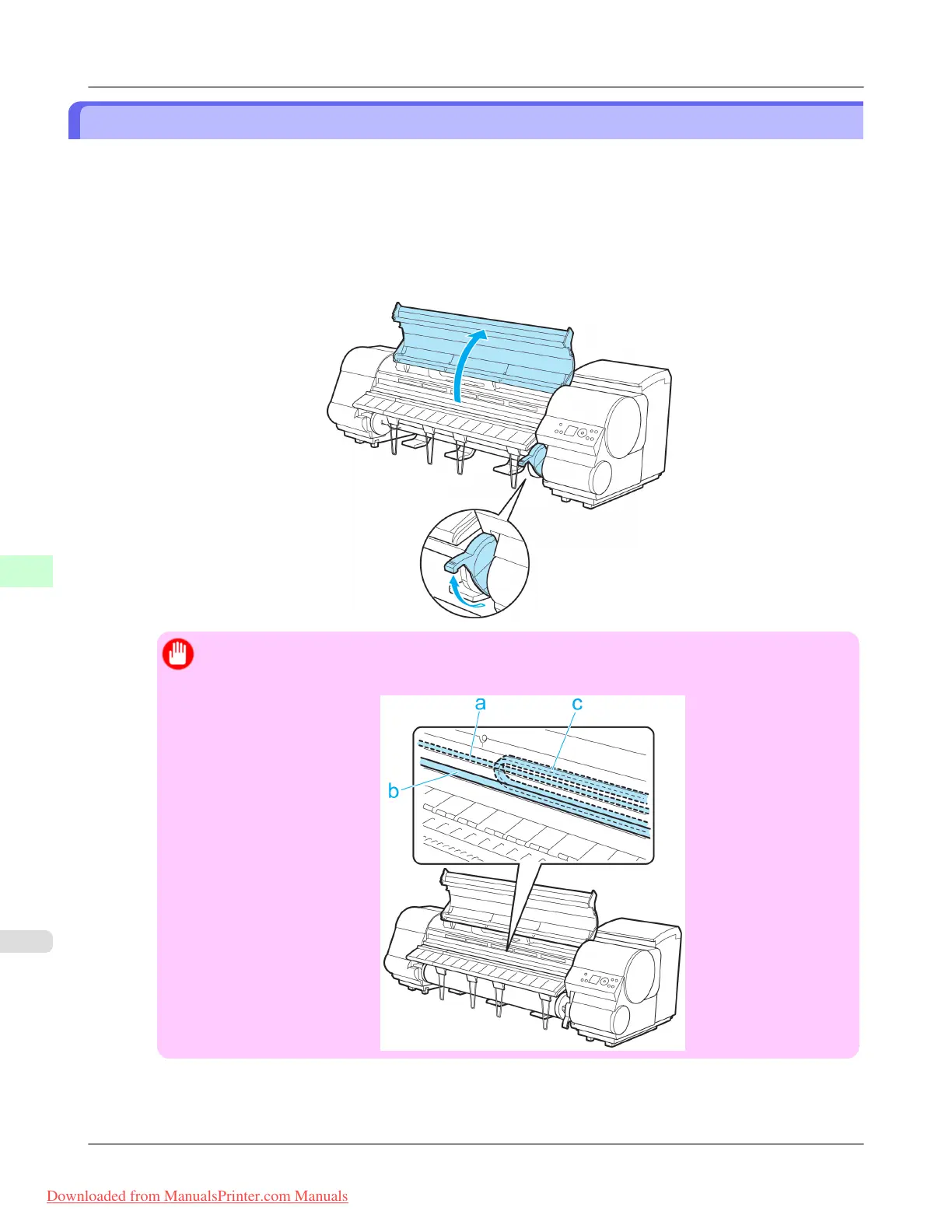 not touch the Linear Scale (a), Carriage Shaft (b), or Ink Tube Stabilizer (c). Touching these parts