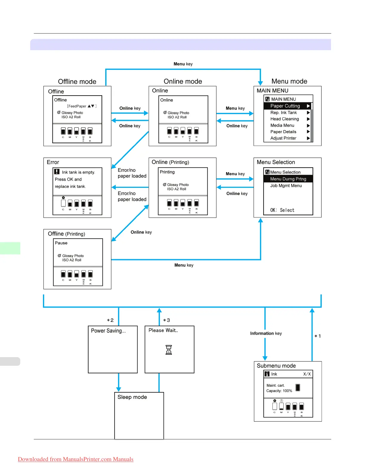 The printer mode transitions are as follows: