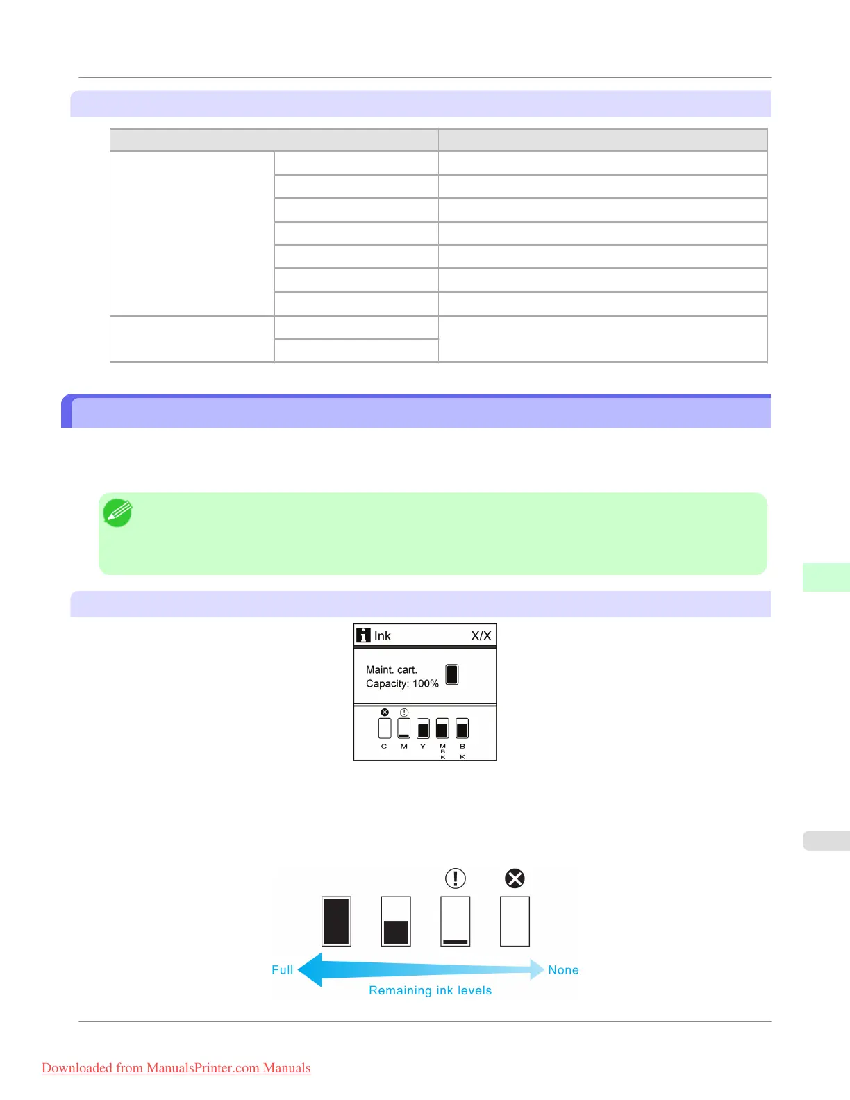 These symbols may be displayed above the ink level: ! if ink is low, × if no ink is left, and ? if ink level detection is not on.
