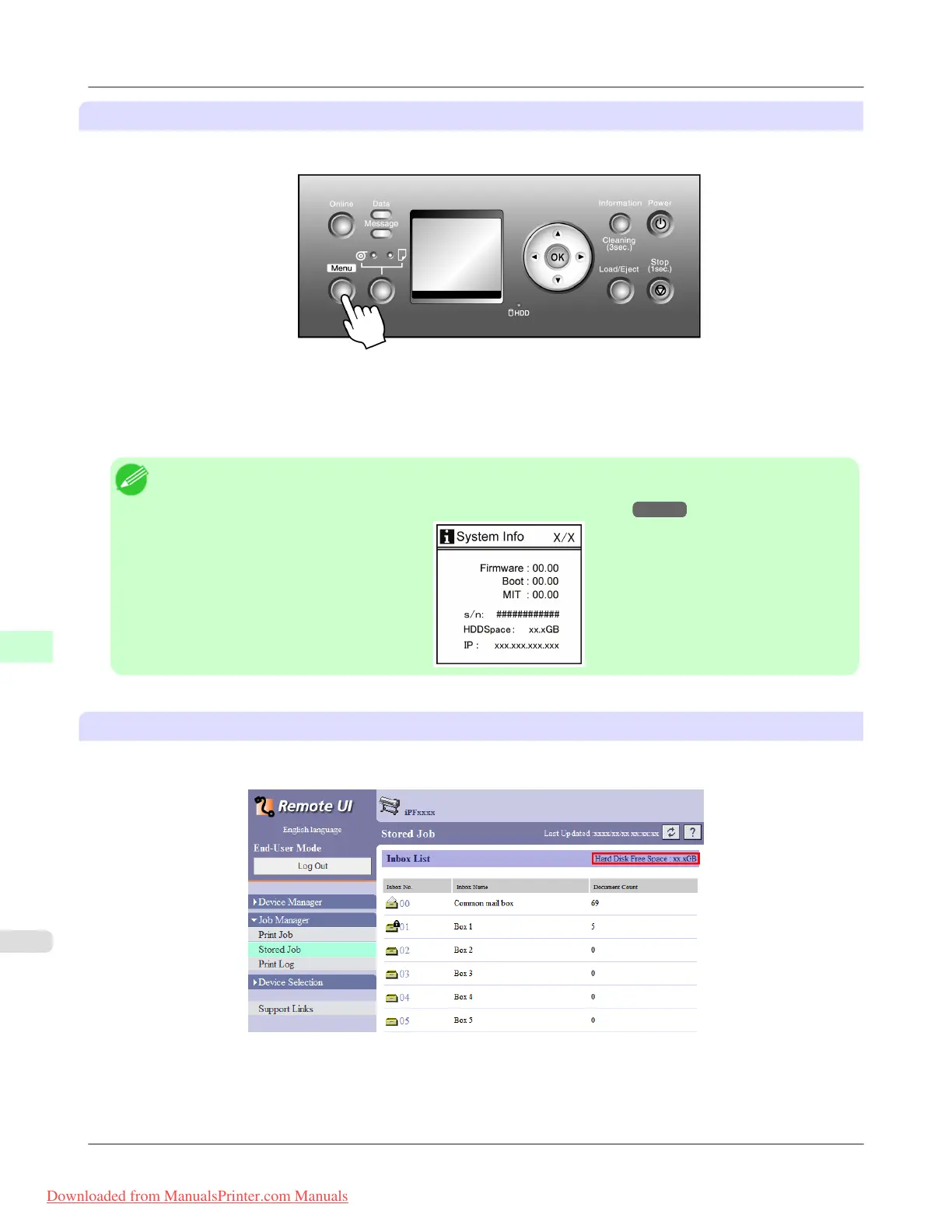 can also check the available hard disk space in the submenu indicating printer information. Press the