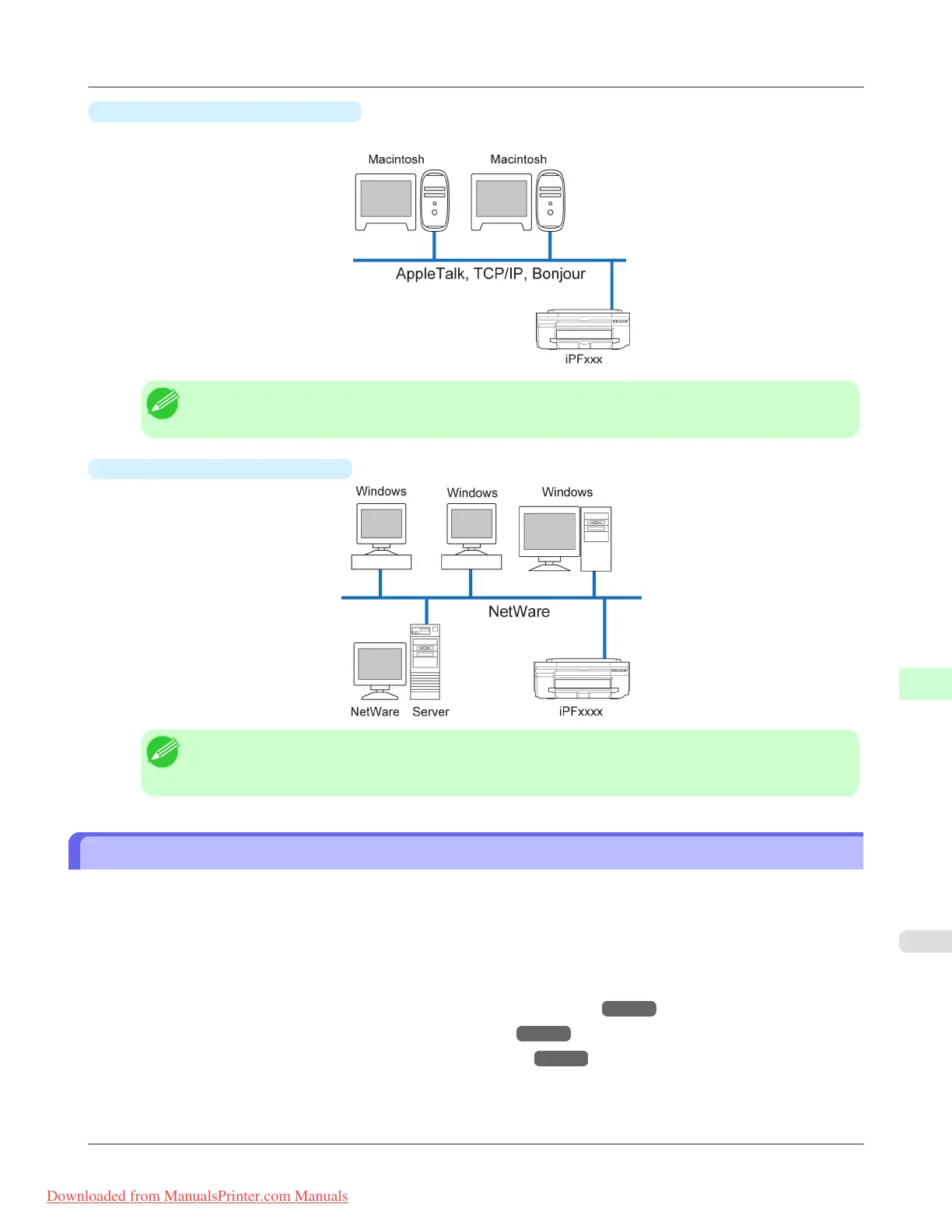 In Macintosh networks, print over AppleTalk (EtherTalk) or TCP/IP, using Bonjour (Zeroconf) functions.
