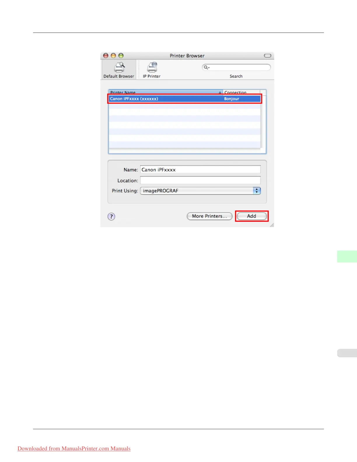 4. Select the printer from the list in the Printer Browser window and click Add.