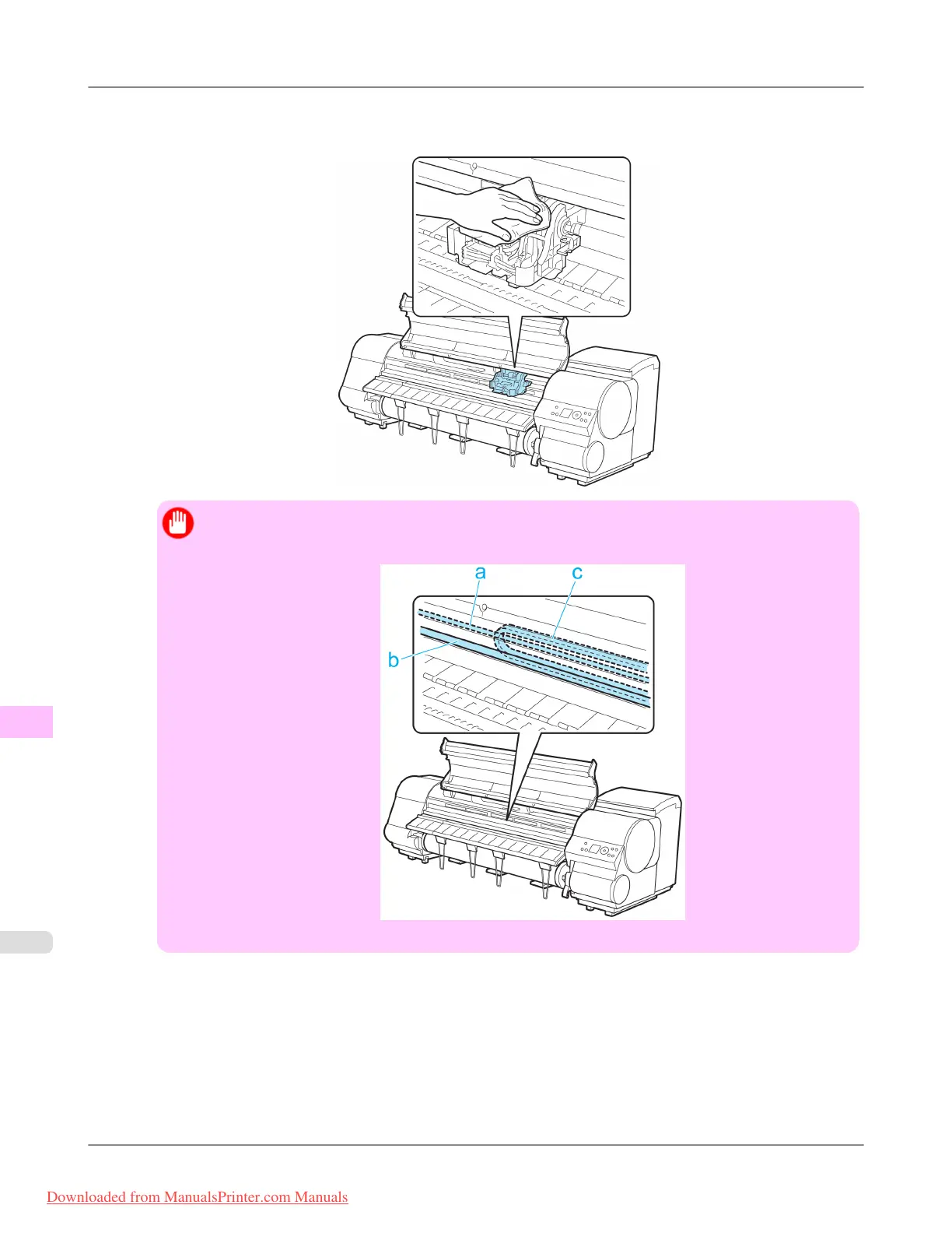 not touch the Linear Scale (a), Carriage Shaft (b), or Ink Tube Stabilizer (c). Touching these parts