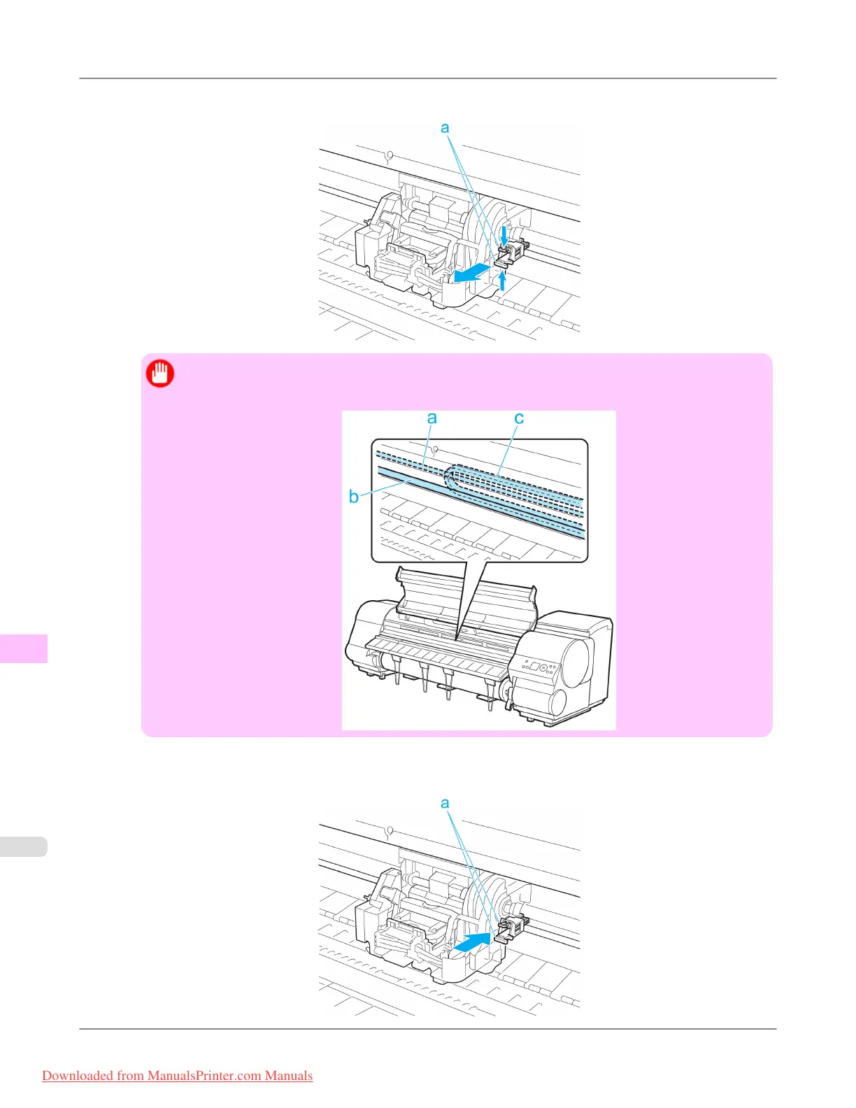 not touch the Linear Scale (a), Carriage Shaft (b), or Ink Tube Stabilizer (c). Touching these parts