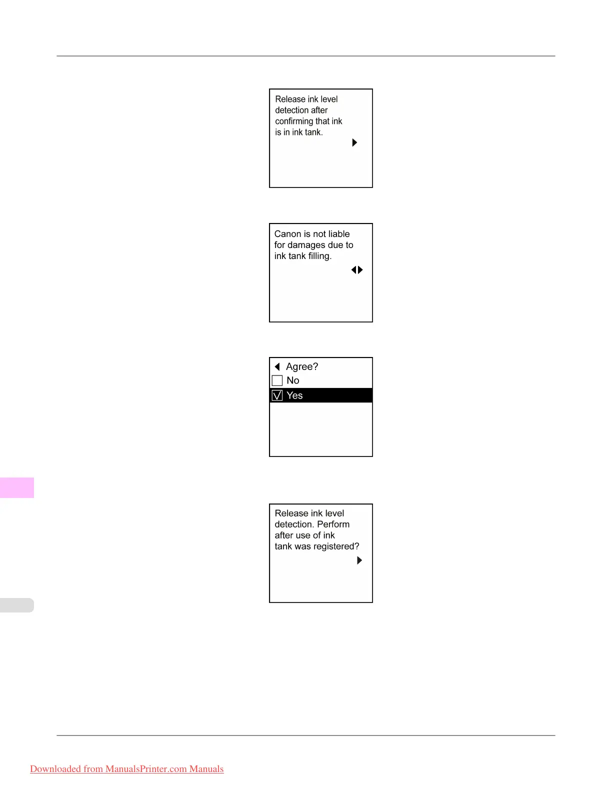 confirmation message about updating ink information is shown on the Display Screen. After checking the mes-