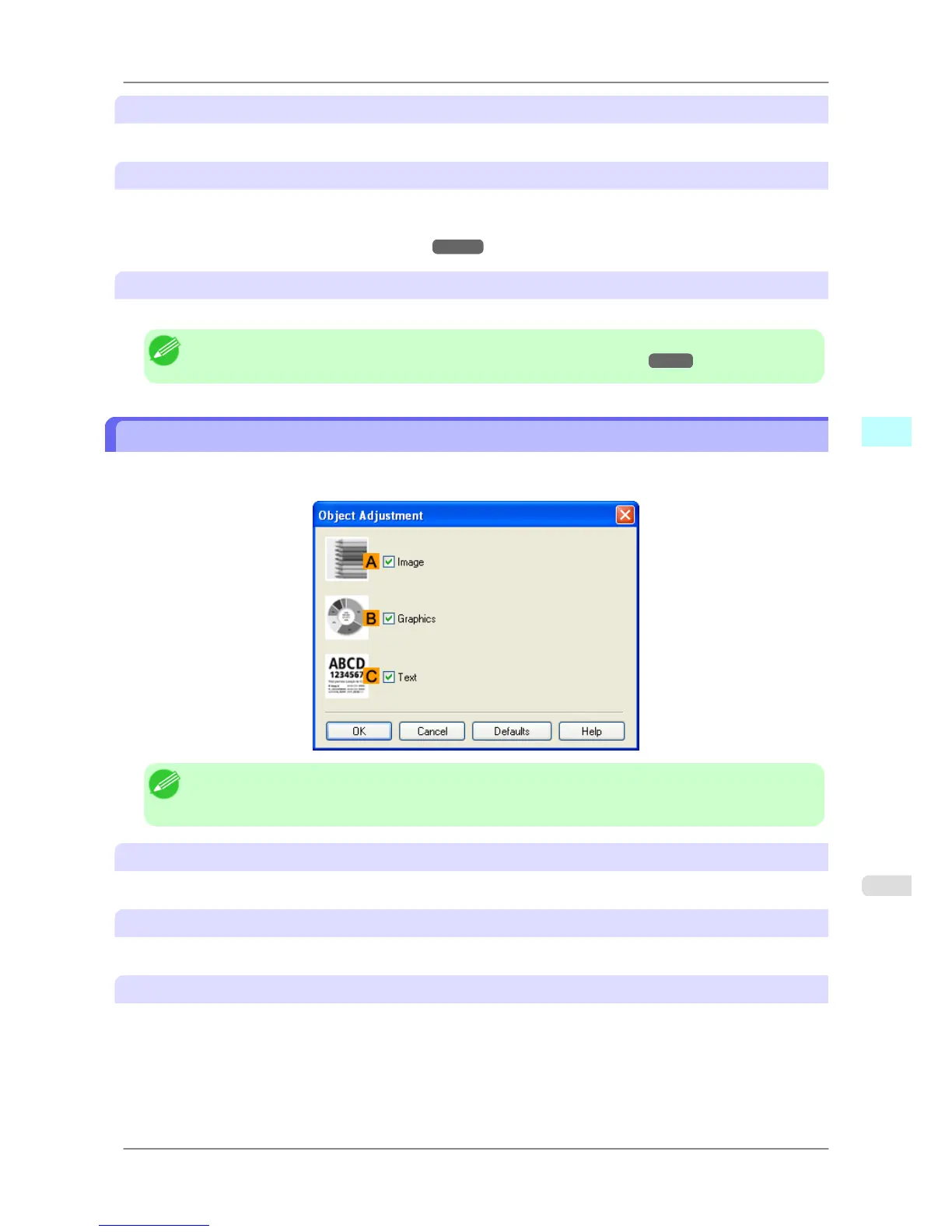In the Object Adjustment dialog box, you can specify what type of print jobs to apply color adjustment to. If an origi-