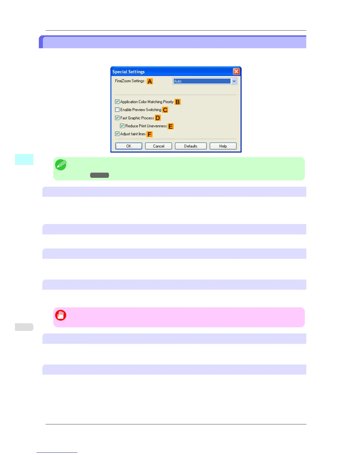 If the printing results are not as you expected, you can change how printing is processed in the Special Settings dialog