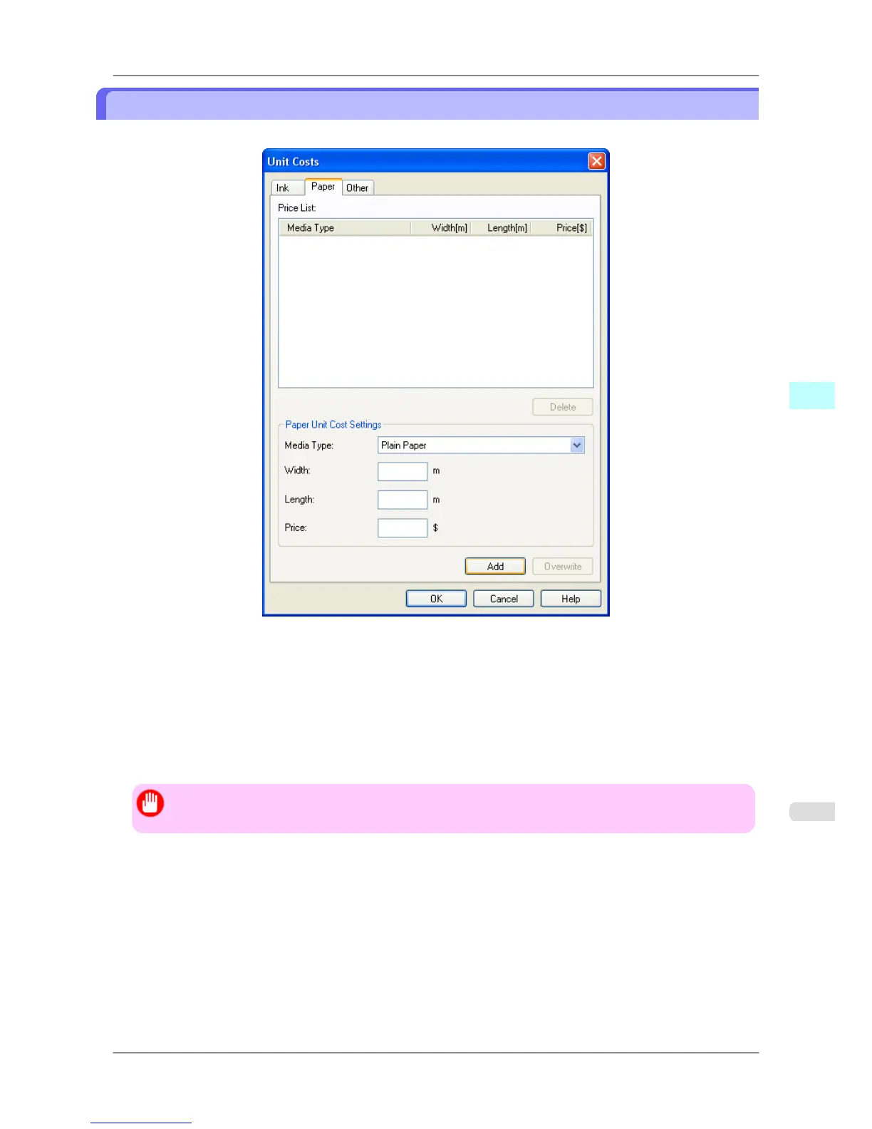iPF825 Setting the Unit Cost for Paper