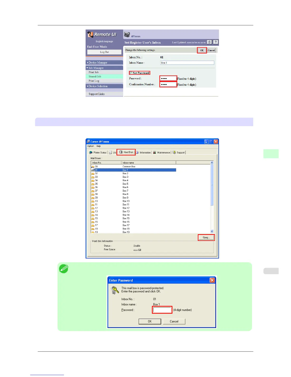 1. On the Hard Disk sheet, select a listed personal box for a password and click Open.