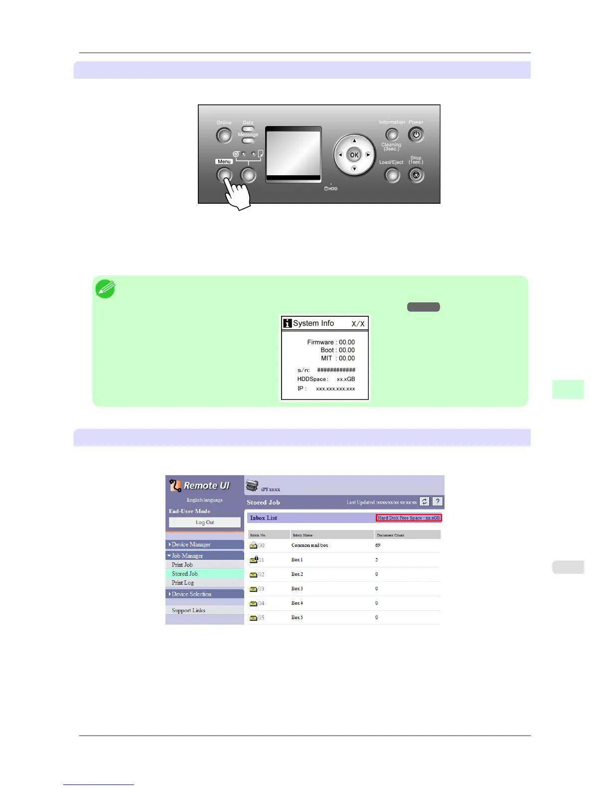 To view the box list, select Stored Job in Job Management. On the Stored Job page, the free hard disk space is shown