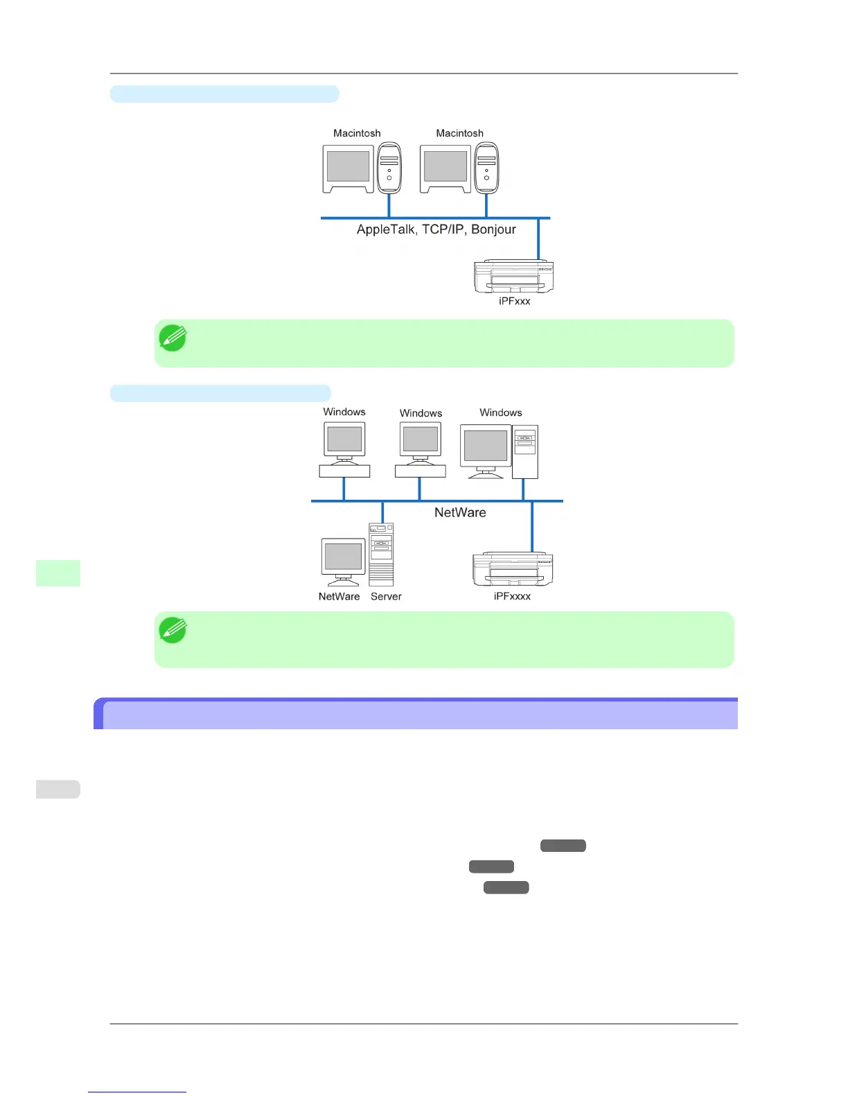 In Macintosh networks, print over AppleTalk (EtherTalk) or TCP/IP, using Bonjour (Zeroconf) functions.