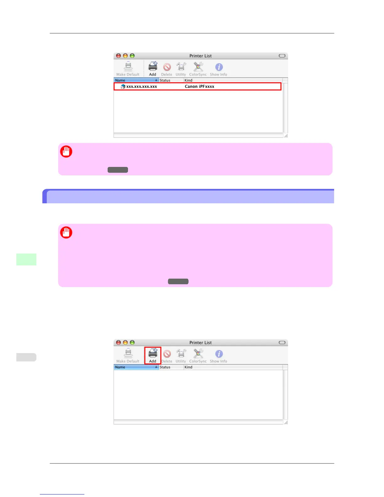 In Mac OS X 10.2.8 and later, use Bonjour functions to easily connect the printer to the network. Follow the steps be-
