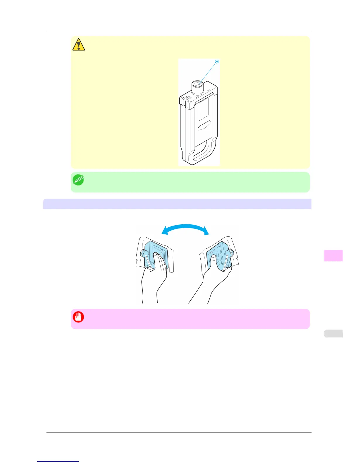 • If you do not agitate the Ink Tank, the ink may sediment, which may affect printing quality.