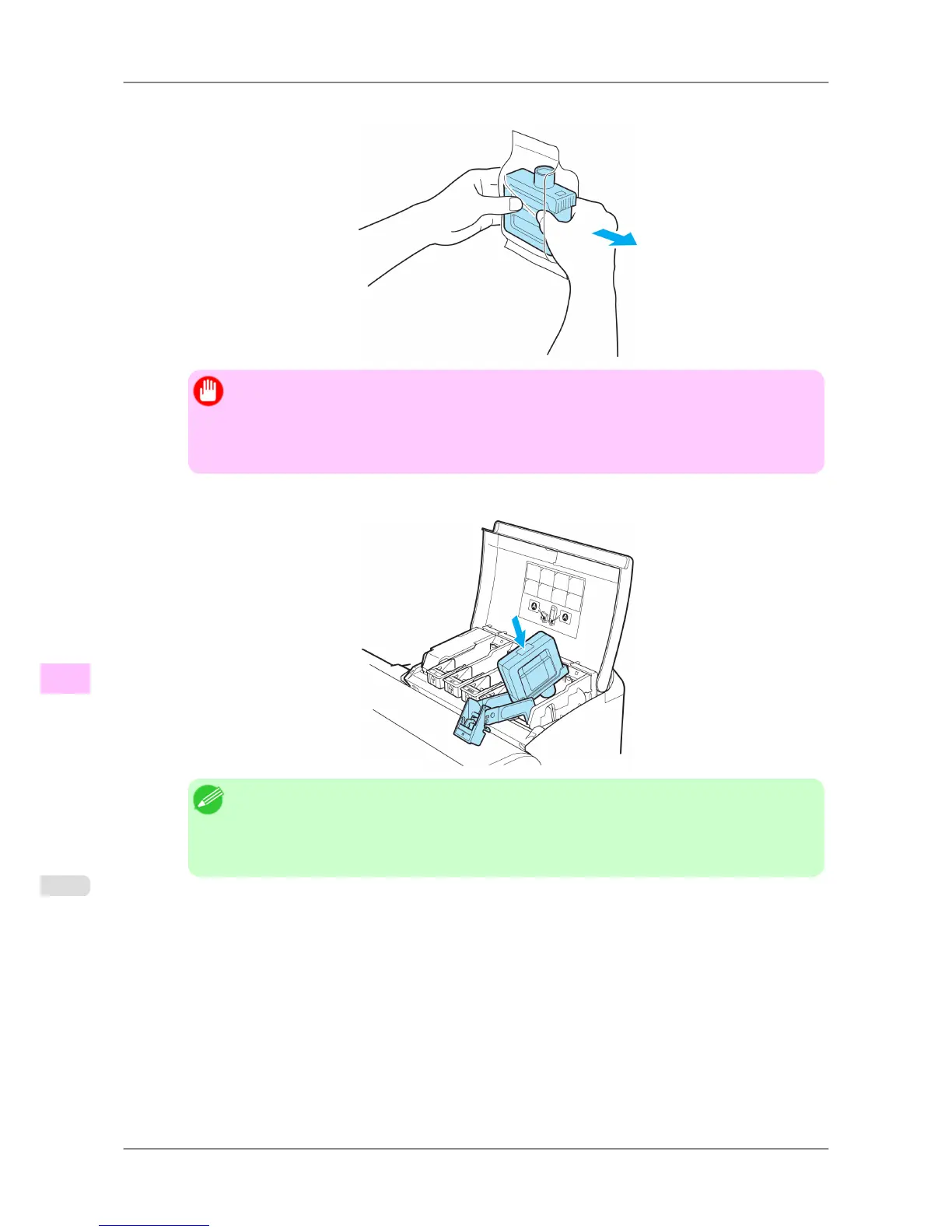 • Do not remove and agitate ink tanks that have already been installed in the printer. Ink may leak